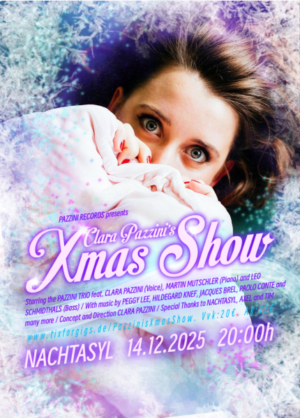 Wir bedauern sehr, Clara Pazzinis Xmas Show absagen zu müssen. Ein ähnlicher Abend wird an gleicher Stelle nachgeholt. Bereits gekaufte Tickets werden storniert und das Geld zurückerstattet.